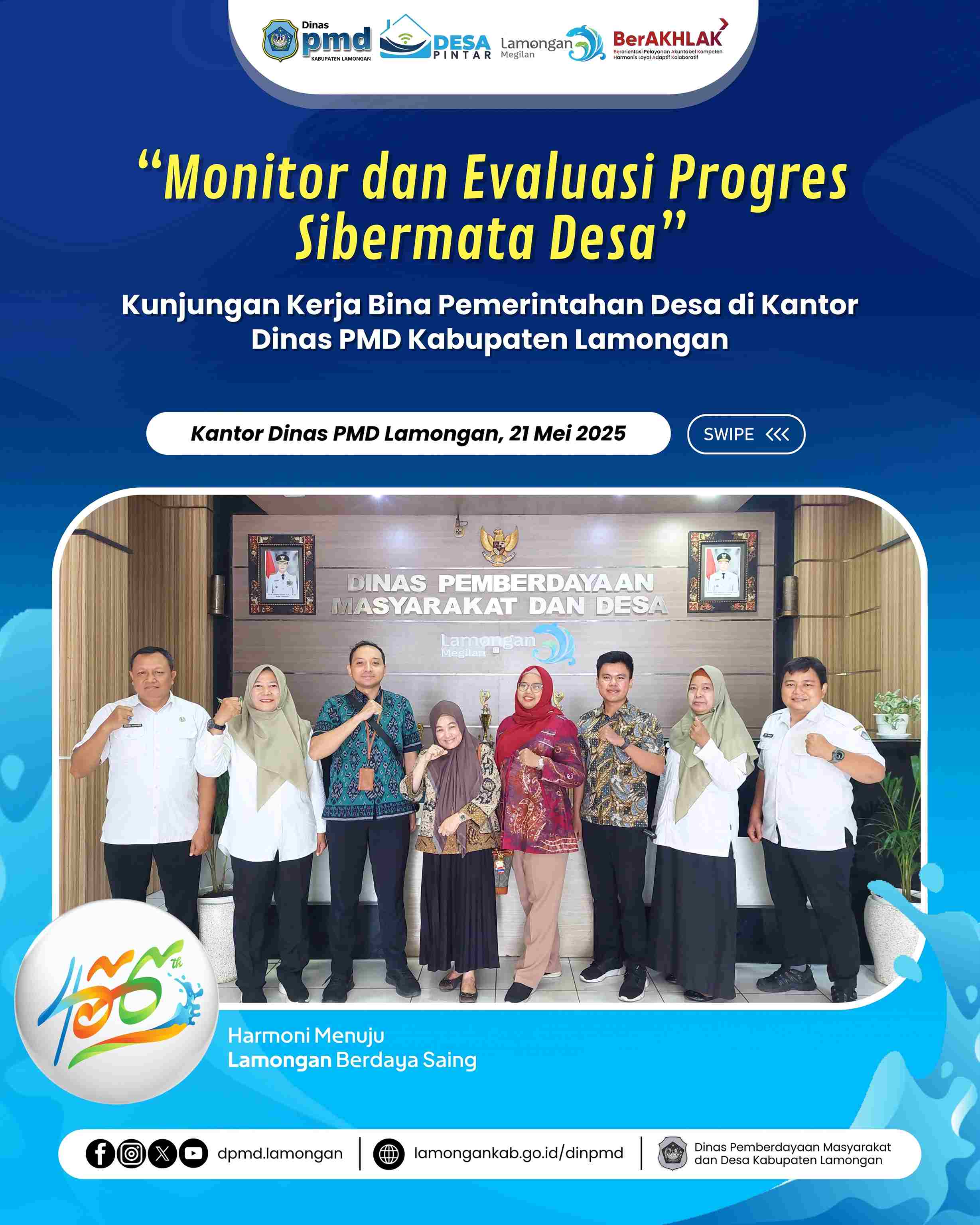 LAMONGAN - Dalam rangka meningkatkan akuntabilitas dan efektivitas tata kelola pemerintahan desa, Dinas Pemberdayaan Masyarakat dan Desa (DPMD) Provinsi Jawa Timur melakukan kunjungan kerja ke kantor Dinas Pemberdayaan Masyarakat dan Desa (Dinas PMD) Kabupaten Lamongan dalam rangka monitor dan evaluasi progres Sibermata Desa yang telah dilaksanakan oleh pemerintahan desa di Kabupaten Lamongan, Rabu (21/05/2025).