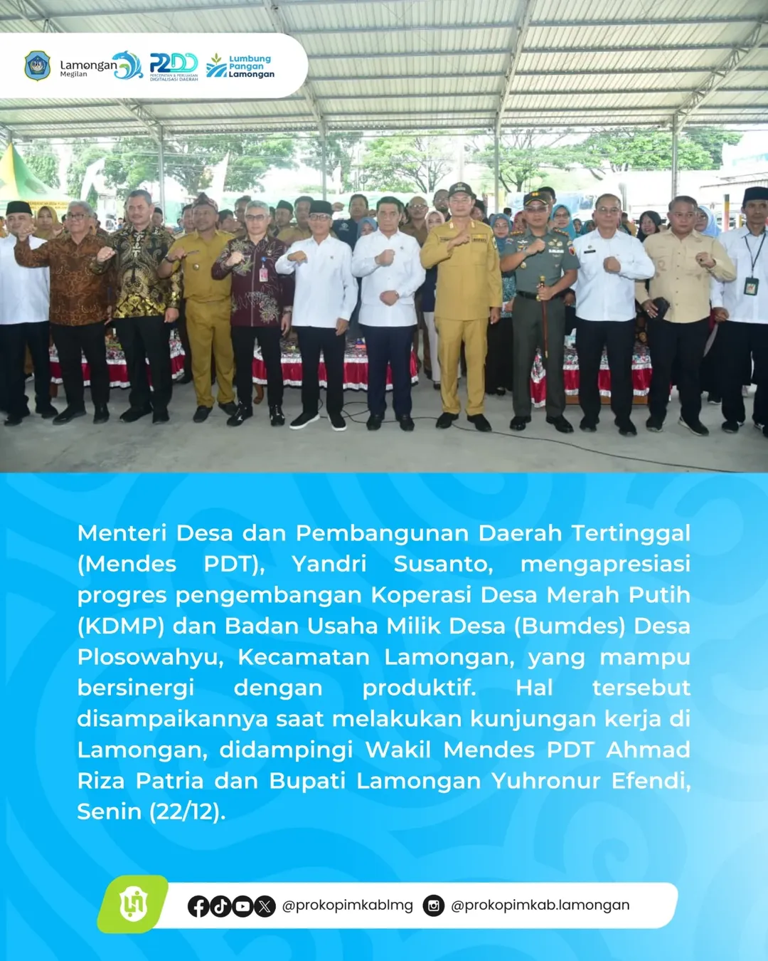 Menteri Desa dan Pembangunan Daerah Tertinggal (Mendes PDT), Yandri Susanto, mengapresiasi progres pengembangan Koperasi Desa Merah Putih (KDMP) dan Badan Usaha Milik Desa (Bumdes) Desa Plosowahyu, Kecamatan Lamongan, yang mampu bersinergi dengan produktif. Hal tersebut disampaikannya saat melakukan kunjungan kerja di Lamongan, didampingi Wakil Mendes PDT Ahmad Riza Patria dan Bupati Lamongan Yuhronur Efendi, Senin (22/12).