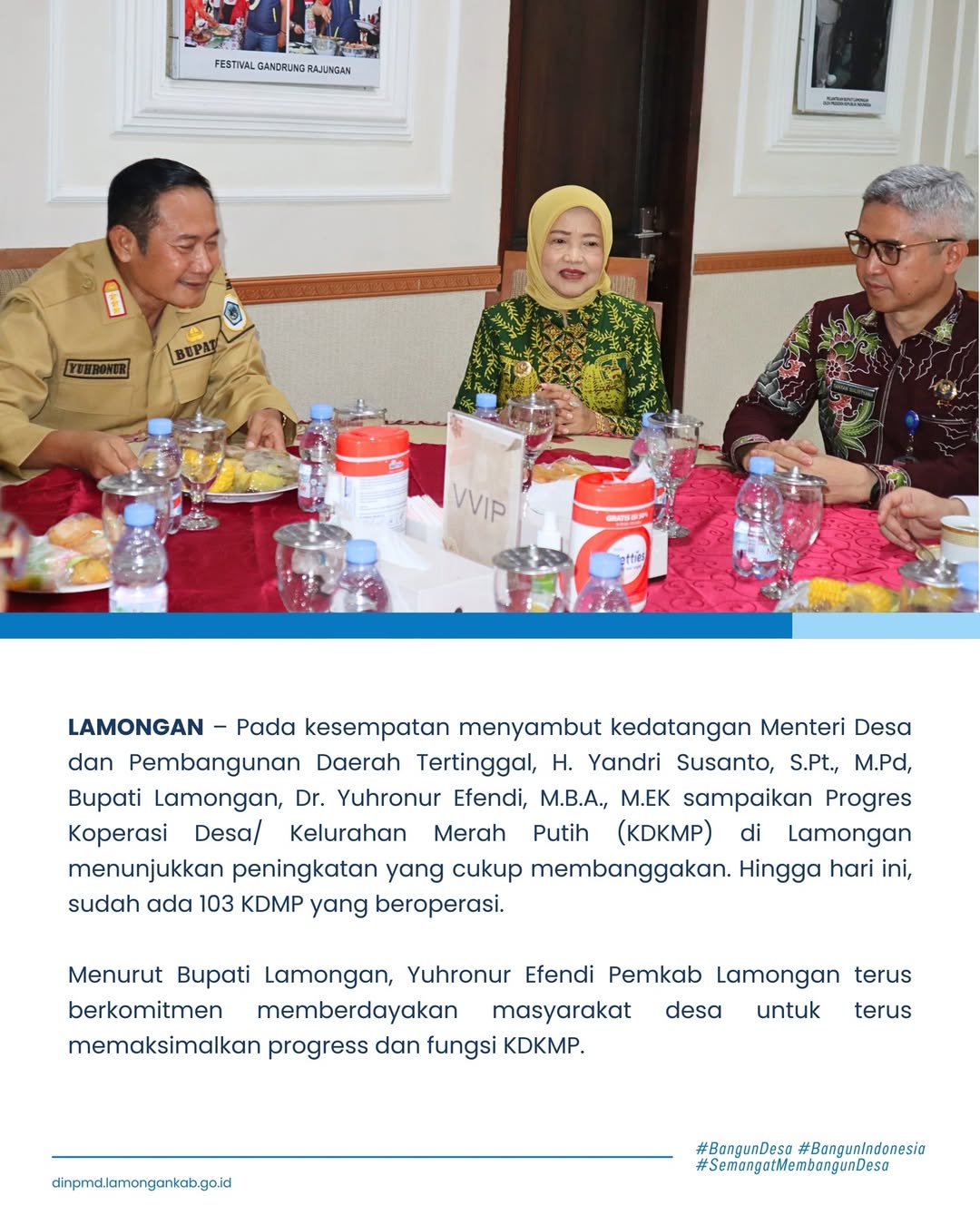 SAMBUT MENTERI DESA PDT, BUPATI LAMONGAN SAMPAIKAN 103 KDKMP DI KABUPATEN LAMONGAN SUDAH BEROPERASI, ADA YANG KERJASAMA DENGAN SPPG