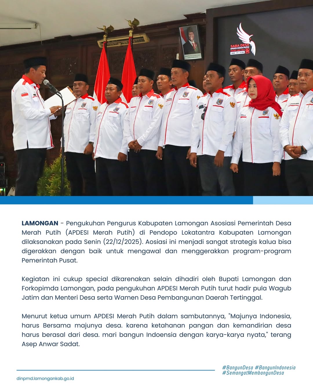 LAMONGAN - Pengukuhan Pengurus Kabupaten Lamongan Asosiasi Pemerintah Desa Merah Putih (APDESI Merah Putih) di Pendopo Lokatantra Kabupaten Lamongan dilaksanakan pada Senin (22/12/2025). Aosiasi ini menjadi sangat strategis kalua bisa digerakkan dengan baik untuk mengawal dan menggerakkan program-program Pemerintah Pusat.