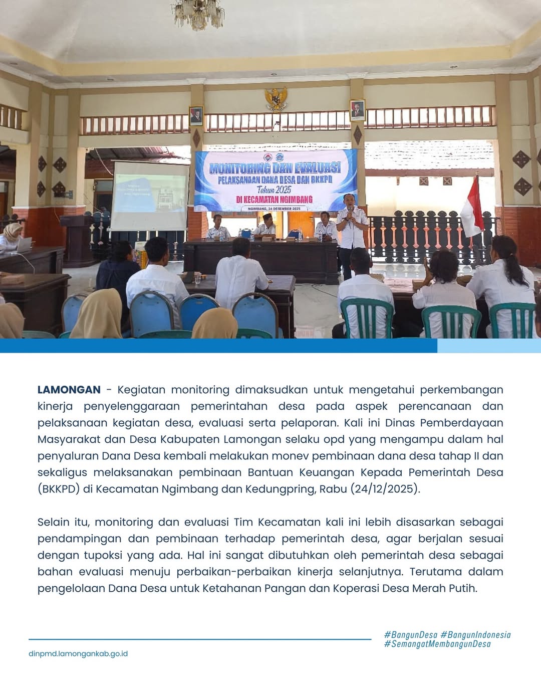 LAMONGAN - Kegiatan monitoring dimaksudkan untuk mengetahui perkembangan kinerja penyelenggaraan pemerintahan desa pada aspek perencanaan dan pelaksanaan kegiatan desa, evaluasi serta pelaporan. Kali ini Dinas Pemberdayaan Masyarakat dan Desa Kabupaten Lamongan selaku opd yang mengampu dalam hal penyaluran Dana Desa kembali melakukan monev pembinaan dana desa tahap II dan sekaligus melaksanakan pembinaan Bantuan Keuangan Kepada Pemerintah Desa (BKKPD) di Kecamatan Ngimbang dan Kedungpring, Rabu (24/12/2025).