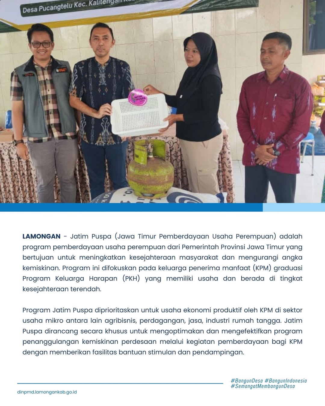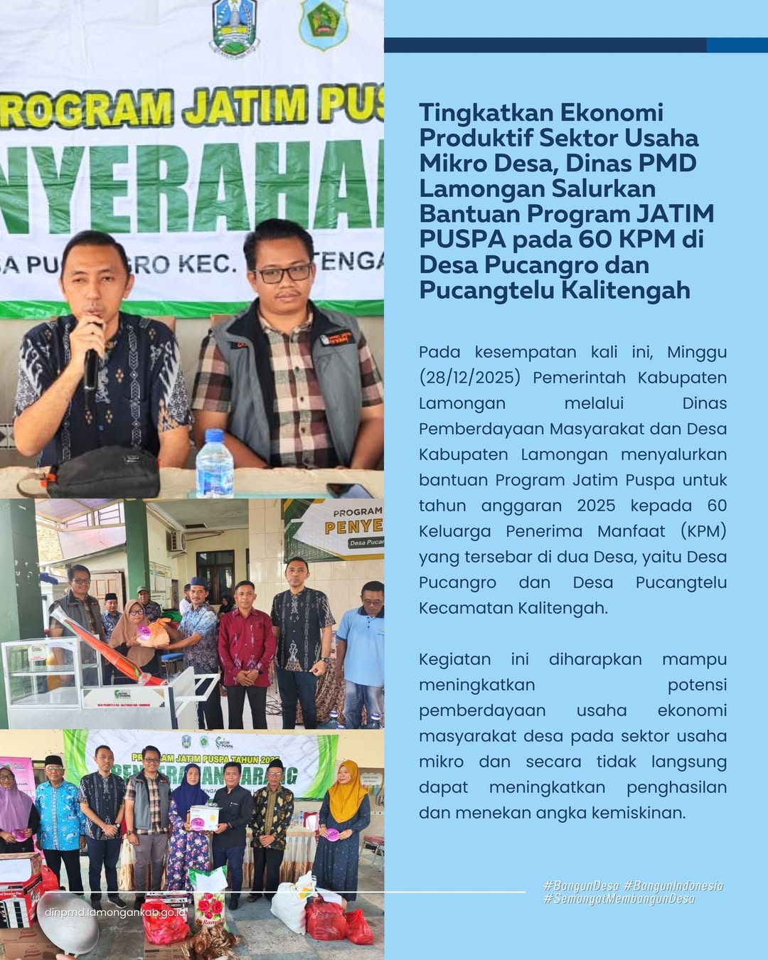 Pada kesempatan kali ini, Minggu (28/12/2025) Pemerintah Kabupaten Lamongan melalui Dinas Pemberdayaan Masyarakat dan Desa Kabupaten Lamongan menyalurkan bantuan Program Jatim Puspa untuk tahun anggaran 2025 kepada 60 Keluarga Penerima Manfaat (KPM) yang tersebar di dua Desa, yaitu Desa Pucangro dan Desa Pucangtelu Kecamatan Kalitengah.