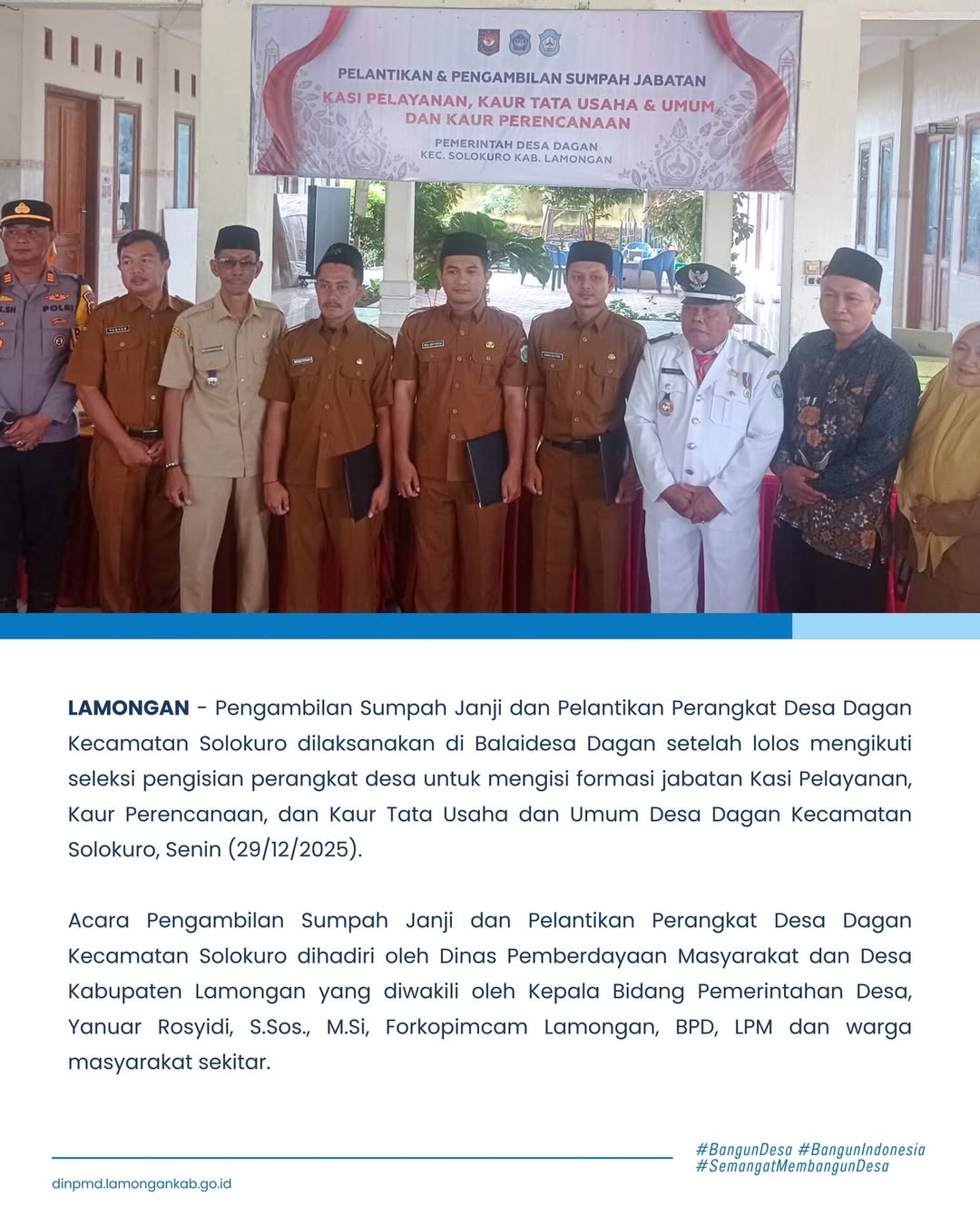 Acara Pengambilan Sumpah Janji dan Pelantikan Perangkat Desa Dagan Kecamatan Solokuro dihadiri oleh Dinas Pemberdayaan Masyarakat dan Desa Kabupaten Lamongan yang diwakili oleh Kepala Bidang Pemerintahan Desa, Yanuar Rosyidi, S.Sos., M.Si, Forkopimcam Lamongan, BPD, LPM dan warga masyarakat sekitar.