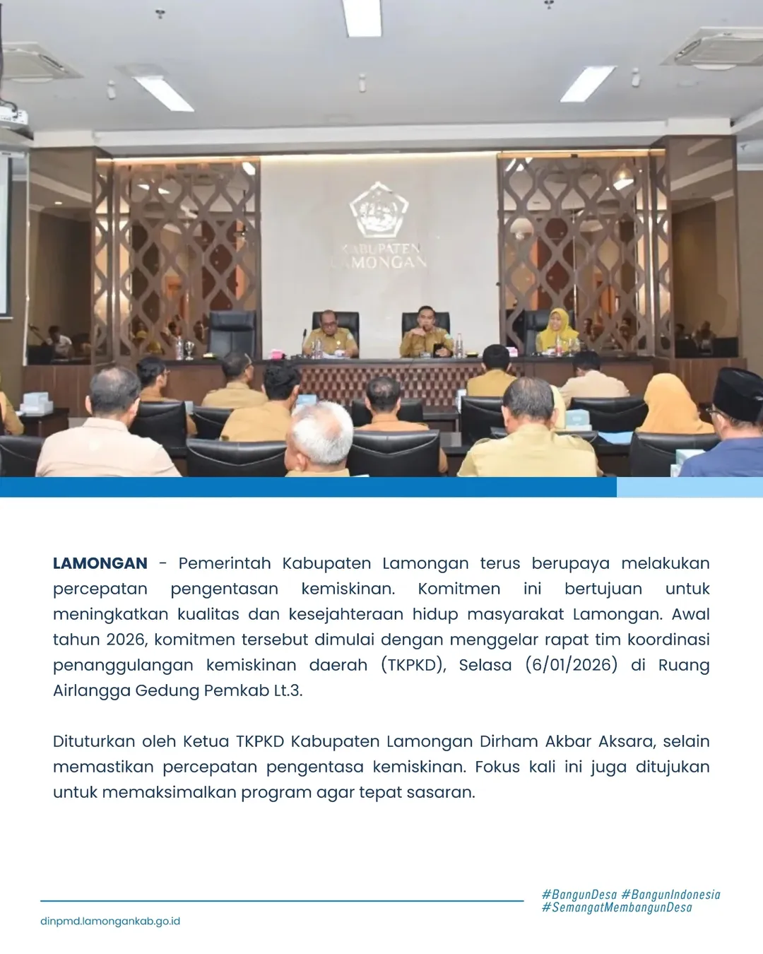 LAMONGAN - Pemerintah Kabupaten Lamongan terus berupaya melakukan percepatan pengentasan kemiskinan. Komitmen ini bertujuan untuk meningkatkan kualitas dan kesejahteraan hidup masyarakat Lamongan. Awal tahun 2026, komitmen tersebut dimulai dengan menggelar rapat tim koordinasi penanggulangan kemiskinan daerah (TKPKD), Selasa (6/01/2026) di Ruang Airlangga Gedung Pemkab Lt.3.
