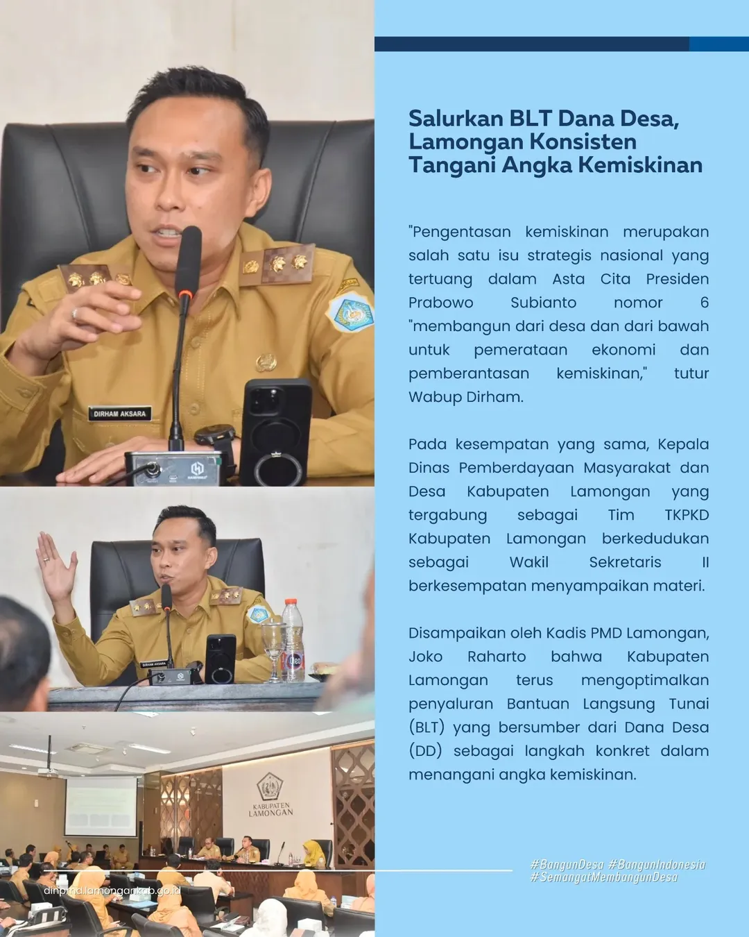 Disampaikan oleh Kadis PMD Lamongan, Joko Raharto bahwa Kabupaten Lamongan terus mengoptimalkan penyaluran Bantuan Langsung Tunai (BLT) yang bersumber dari Dana Desa (DD) sebagai langkah konkret dalam menangani angka kemiskinan.