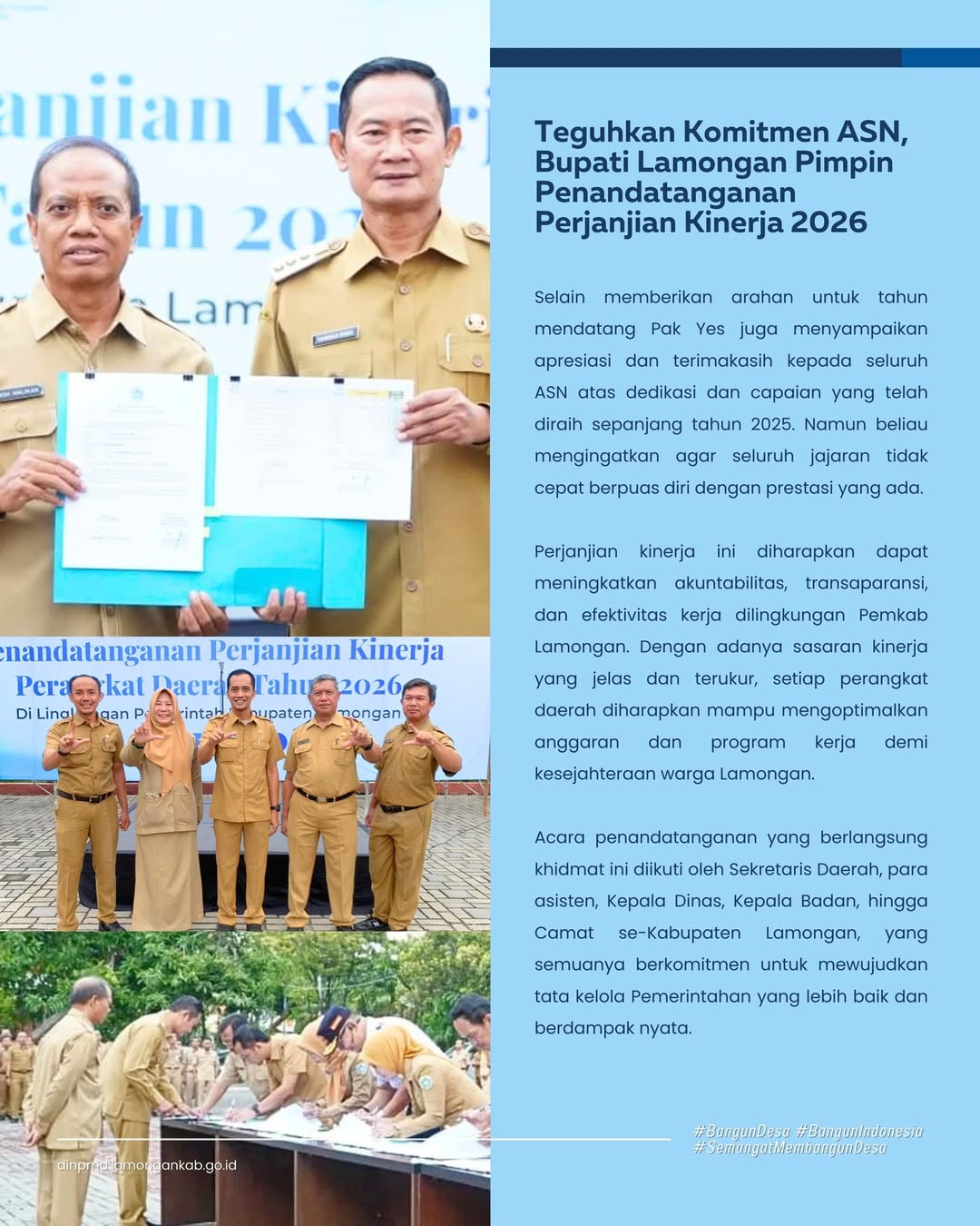 Dalam amanatnya, Bupati Lamongan Pak Yes, menegaskan bahwa penandatanganan ini adalah momentum krusial untuk meneguhkan tekad dan niat seluruh ASN di Lamongan. Beliau berharap setiap pejabat memiliki rasa tanggung jawab yang sama dalam menjalankan misi serta mencapai target kinerja di perangkat daerah masing-masing.
