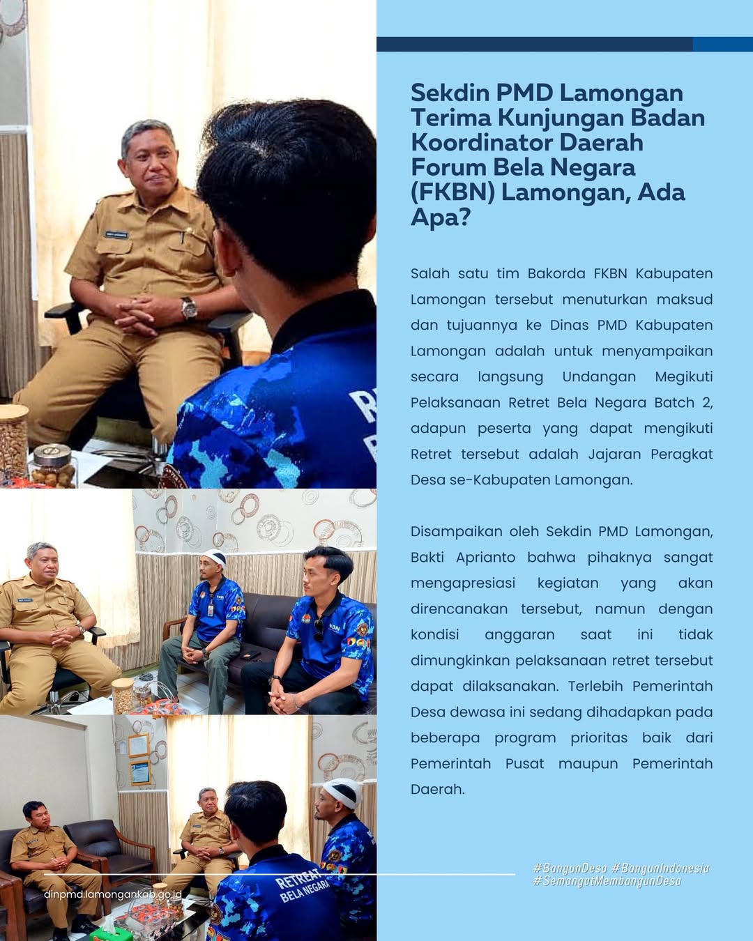 Salah satu tim Bakorda FKBN Kabupaten Lamongan tersebut menuturkan maksud dan tujuannya ke Dinas PMD Kabupaten Lamongan adalah untuk menyampaikan secara langsung Undangan Megikuti Pelaksanaan Retret Bela Negara Batch 2, adapun peserta yang dapat mengikuti Retret tersebut adalah Jajaran Peragkat Desa se-Kabupaten Lamongan.