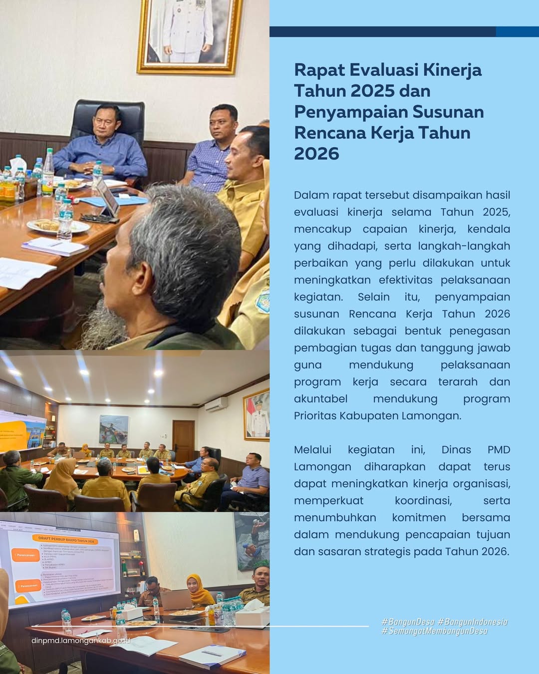 LAMONGAN – Dinas Pemberdayaan Masyarakat dan Desa Kabupaten Lamongan melaksanakan Rapat Evaluasi Kinerja Tahun 2025 sekaligus penyampaian susunan Tim Kerja Tahun 2026. Kegiatan yang dilaksanakan di ruang rapat Bupati Lamongan ini dilaksanakan sebagai bagian dari upaya evaluasi terhadap pelaksanaan tugas dan fungsi organisasi serta perencanaan pelaksanaan program dan kegiatan pada tahun berikutnya.